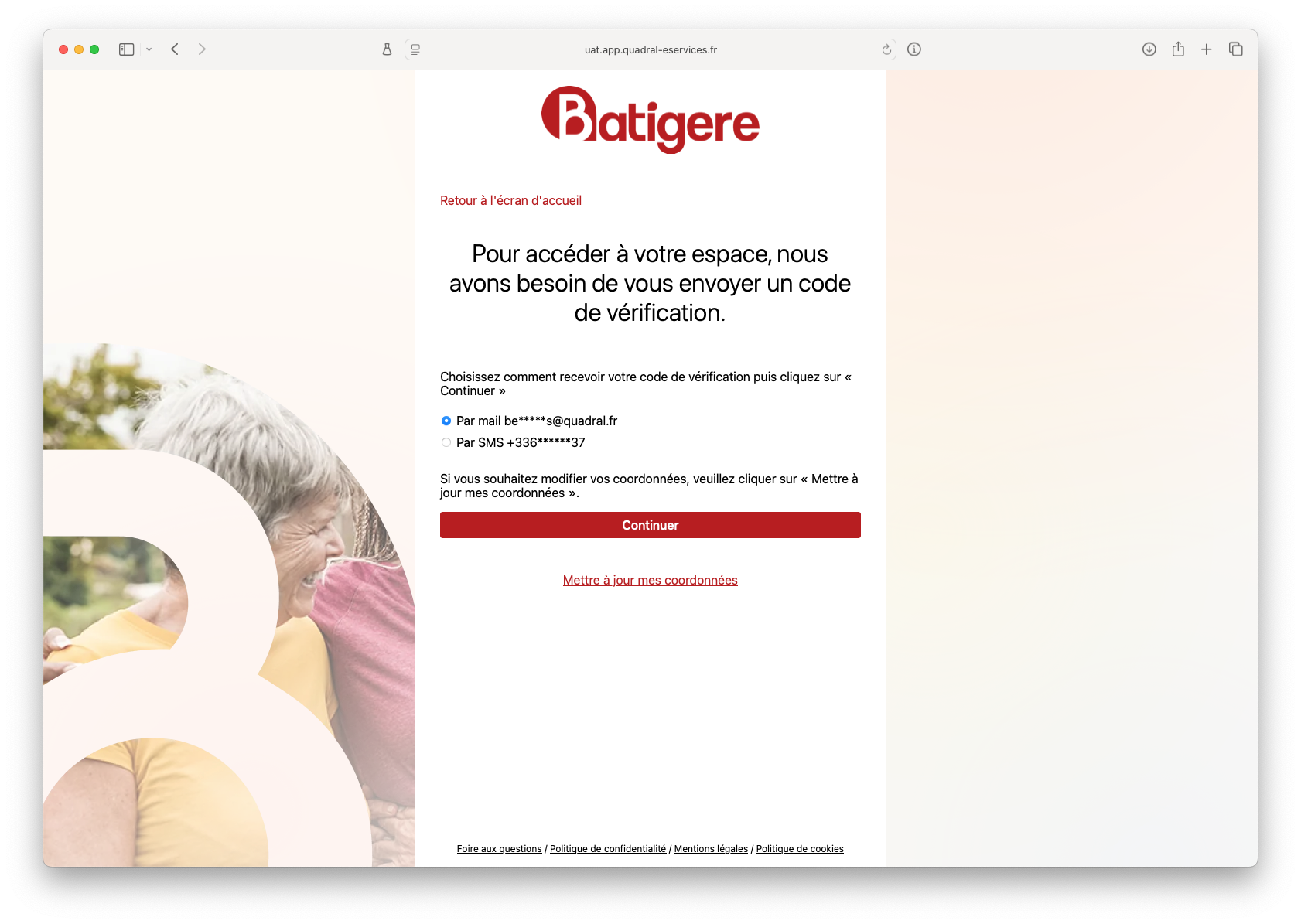 L'utilisateur peut choisir de recevoir son code de vérification par e-mail ou par SMS.